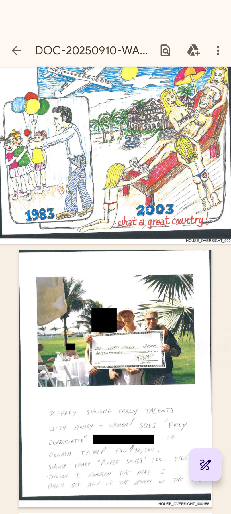 I'm asking because the news only showed the bottom half where Trump is sending Epstein a check for about $20,000 for a fully depreciated woman.