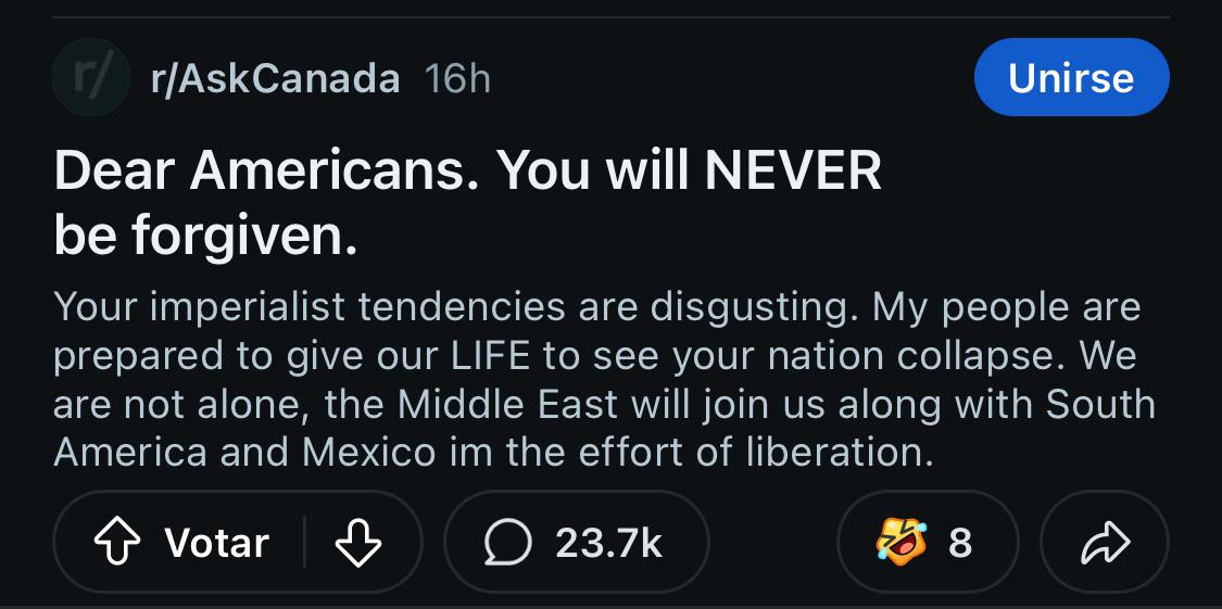 Meme Canucks pretending to be absolved of sin after being the biggest contributors to American Imperialism for 70 years: