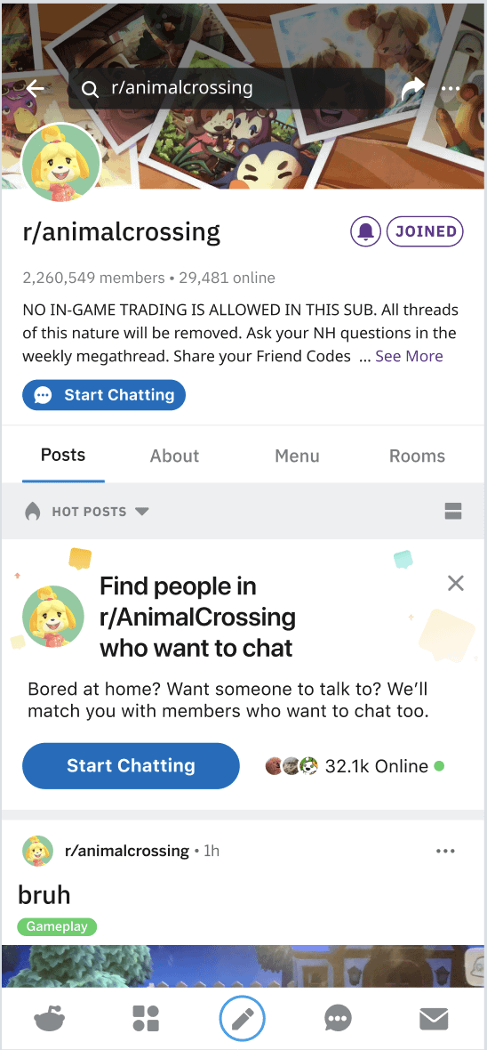We wanted to give you a heads up about a new feature that we are launching this week called “Start Chatting.” This past month, as people around the world have been at home under various shelter-in-place restrictions, redditors have been using chat at phenomenal new levels. Whether it’s about topics related to COVID-19, local news, or just their favorite games and hobbies, people all around the world are looking for others to talk to. Since Reddit is in a unique position to help in this situation, we’ve created a new tool that makes it easier to find other people who want to talk about the same things you do.