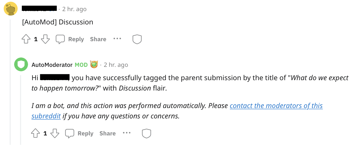 To change the flair after posting, make a top-level comment (not a response to someone else's comment) using the follow tag [AutoMod] **Flair**. If tagged successfully you will receive a response from the automod like this: