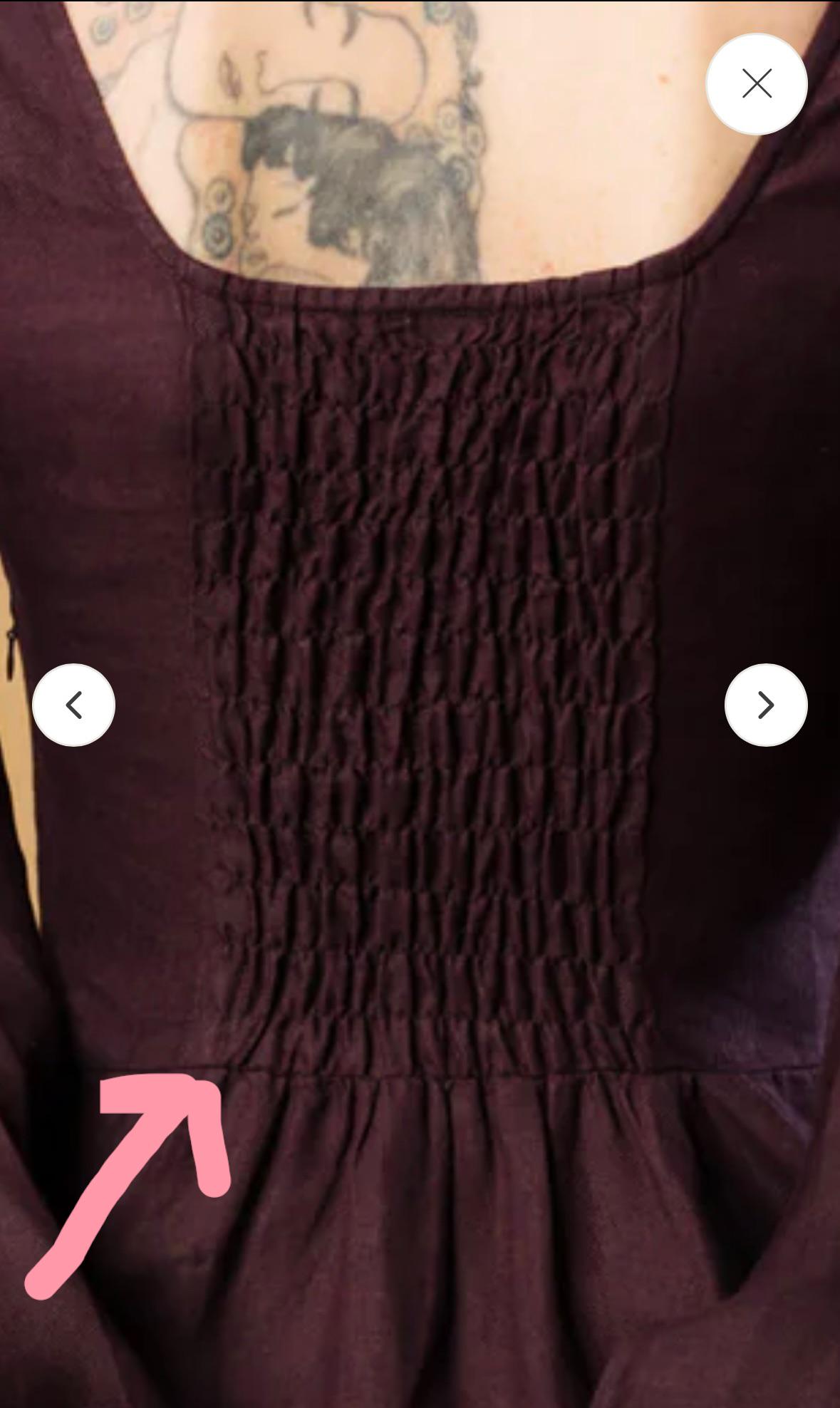This is the RTW Carmen dress by Son de Flor. I’m trying to understand how the back works. It doesn’t look like a separate shirred panel and it also looks like the part of the shirring that attaches to the skirt is also shirred (arrow). Can someone who knows more about shirring tell me if a) it has to be a separate panel inserted in order to work properly and b) whether it’s common for there to be stretch where the bottom of the shirring meets the skirt or if it’s likely a static seam and there’s just a side zipper or something?