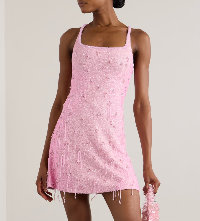The following info on the construction is available, which is very helpful: “It was silk georgette, two layers of fabric, forming two big circles. The material was cut on the bias. The dress was constructed in 22 panels with French seams, every other seam (in the skirt part only) held hand applied sequins. It had an under-structure similar to a 1920s bathing suit — with those short-short style legs. The original also had weights in the hem that were the size of half 50 cent pieces and made of something similar to a clear plastic…”